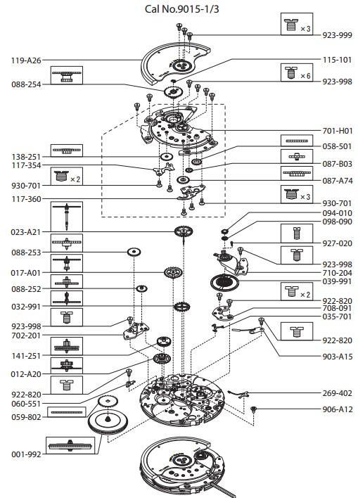 9015与现有的机械机芯82系列采用的传动形式不同,共用的零部件很少。82系列是将秒轮从中心位置移开,把轮子平面排列不重叠而实现它的美观,很适合做全镂空的手表。9015做得很薄,各零部件的形状很精致,配合又很紧密,很适合衍生开发多针或多功能机芯。
