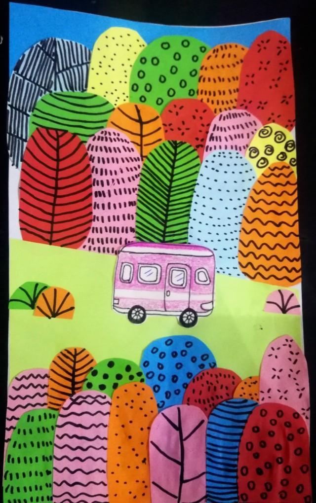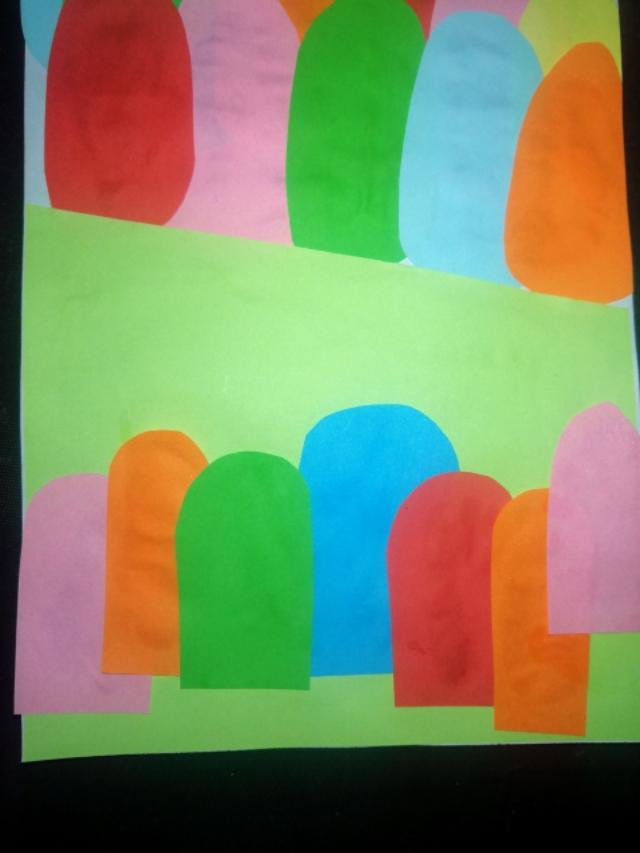 4.再剪一些高低不同、颜色各异、不规则的半圆形当做树,也是从上到下、高低错落、互相遮挡的贴在画面下方。