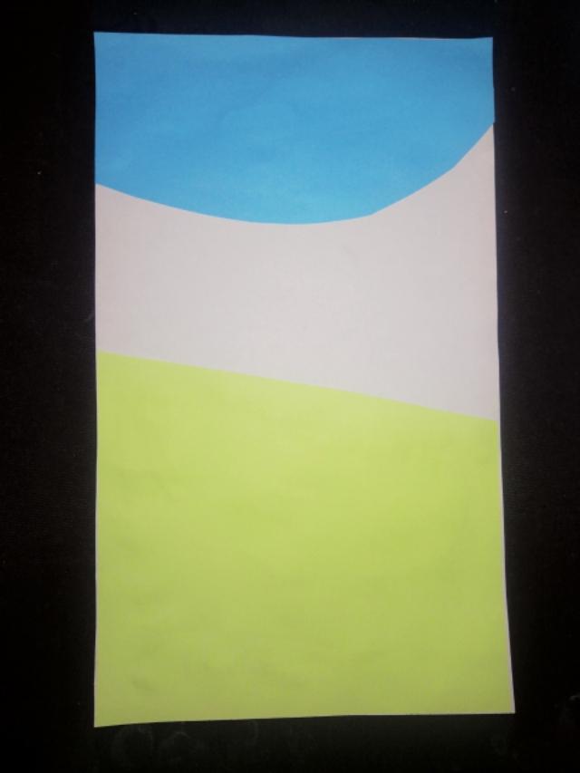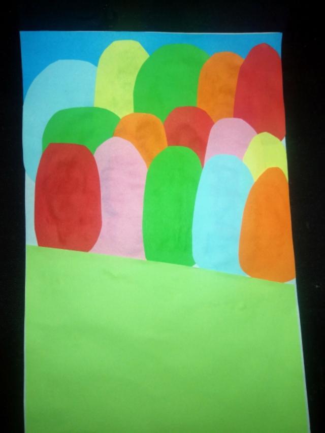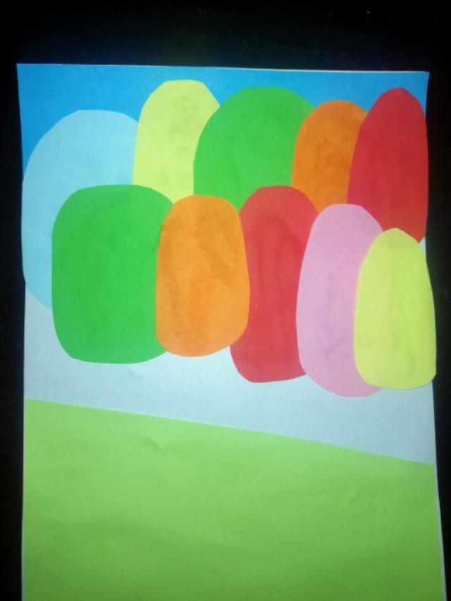 3.剪一些大小不一,颜色各异的不规则的椭圆形状当做树,并从上到下,高低错落,互相遮挡的贴在草地上部分画面中。