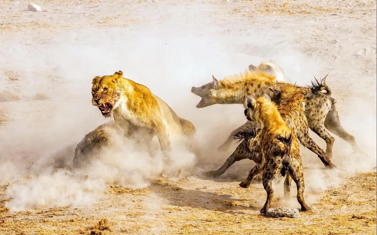 如果在前面的一条鬣狗不小心被狮子咬住之后,其他的鬣狗也会一窝蜂涌上来,直接用上掏肛的技能,在这些鬣狗的压力之下,狮子也不得不放弃咬住的鬣狗,因为狮子要是稍微有一点迟疑,它的肛门就会不保。