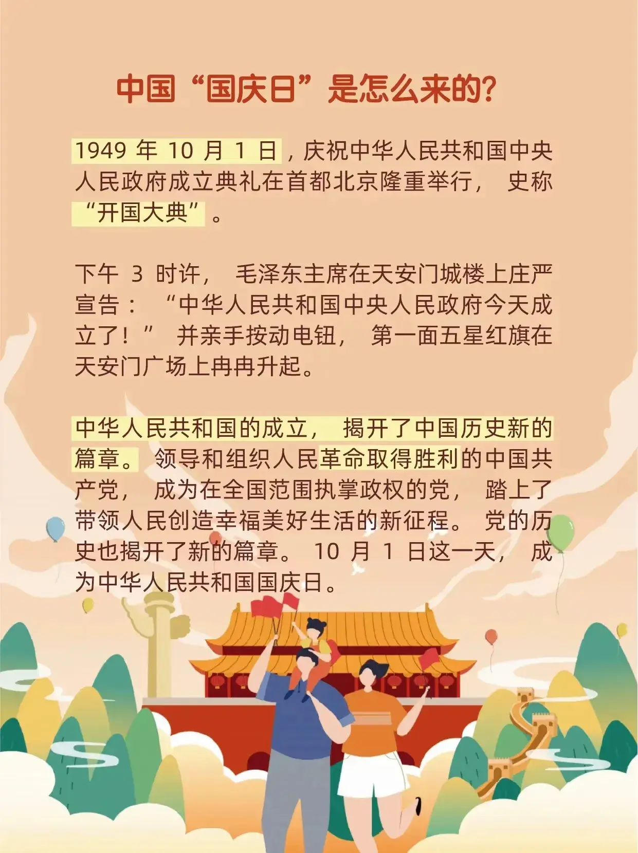 国庆节的由来可以追溯到1949年的这一天,当时毛泽东主席在北京天安门城楼上庄严宣布新中国的成立。这一历史时刻使得国庆节具有了深厚的意义和象征,成为全国庆祝的日子。以国庆为契机,整个中国人民经历了残酷的战争年代后,终于获得了解放与新生。