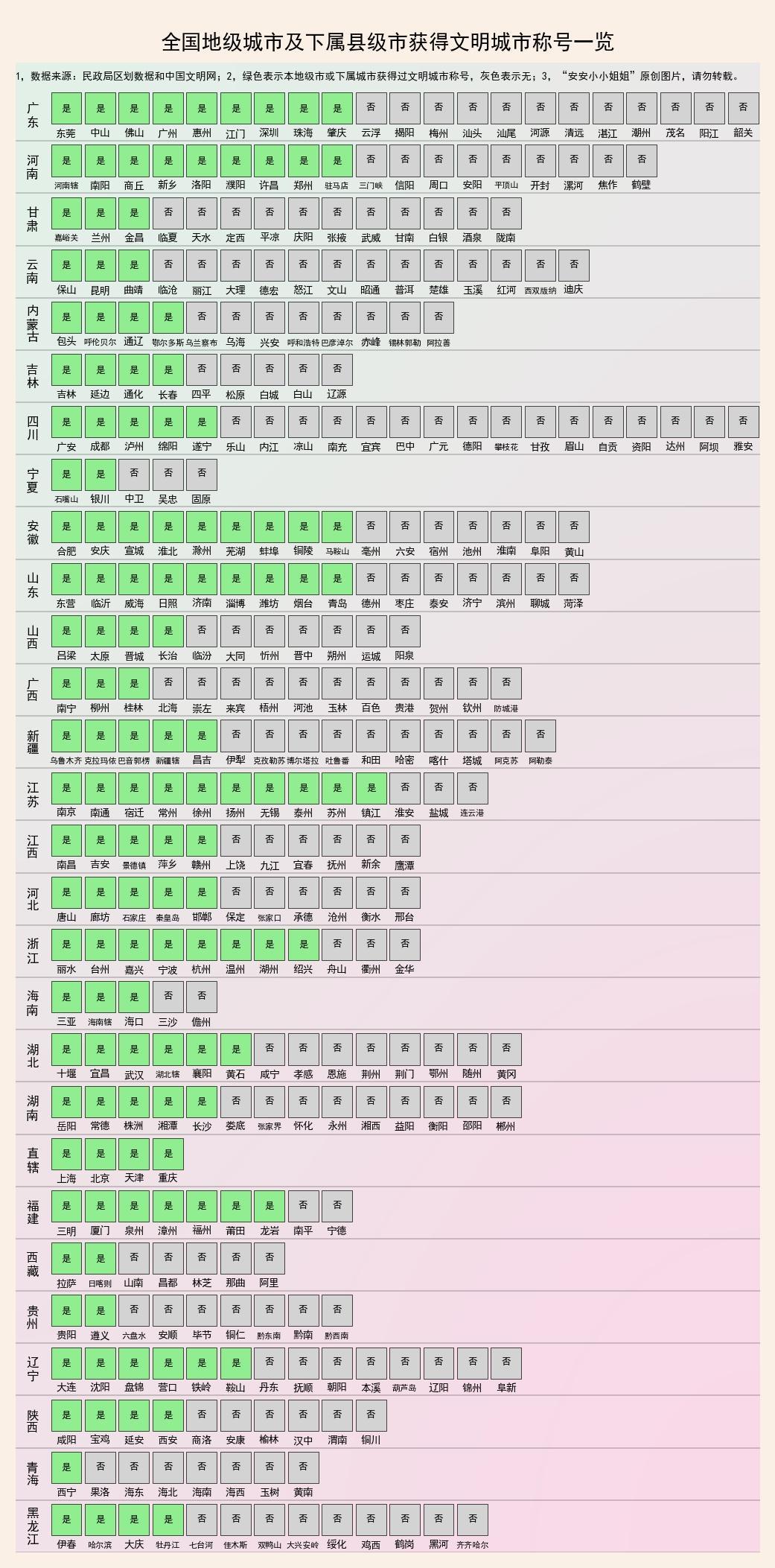 说明:为了统计的方便,如果某个地级行政区、其下辖区或县获得过“文明城市”称号,此处均统计为此地级行政区获得过“文明城市”称号。