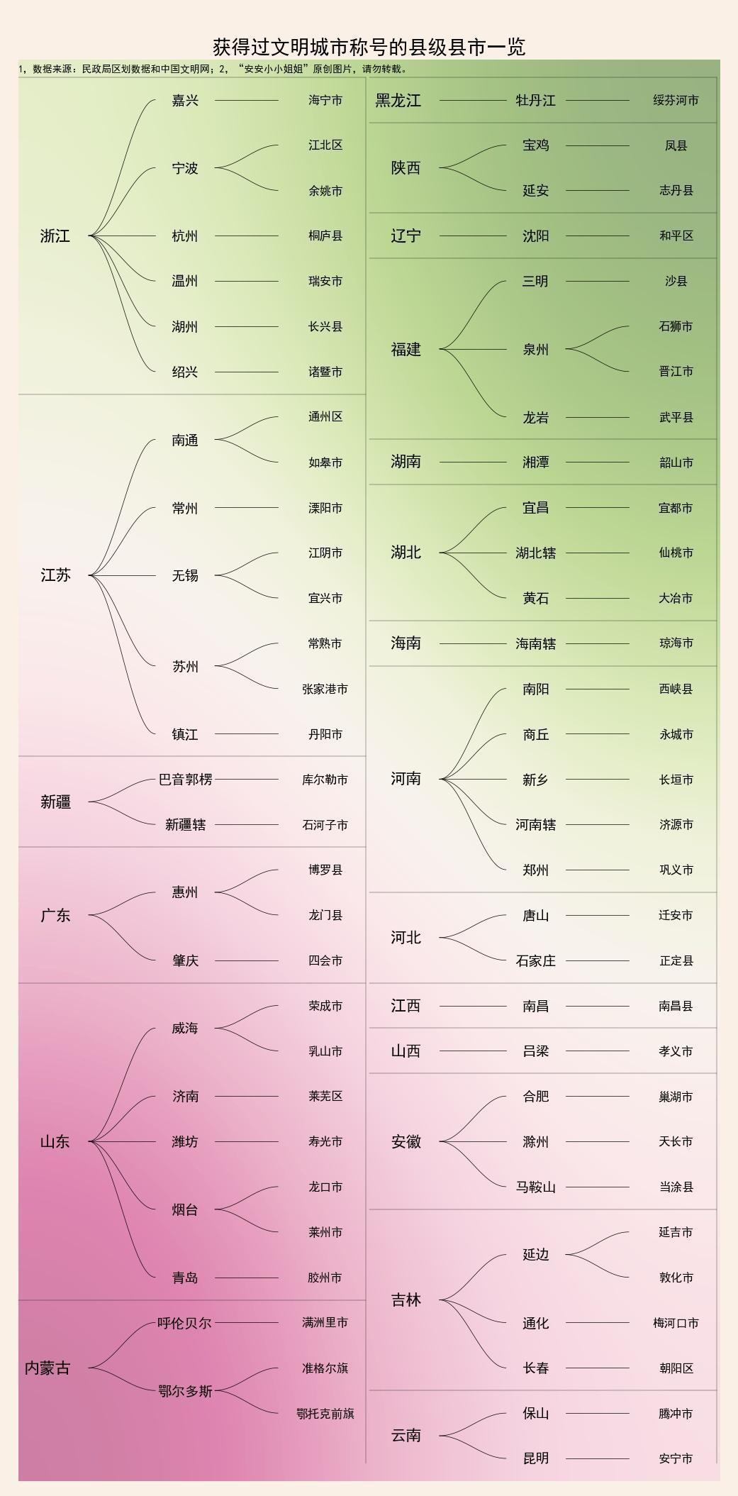 安徽、山东和广东则分别有九个城市获得过“文明城市”称号。