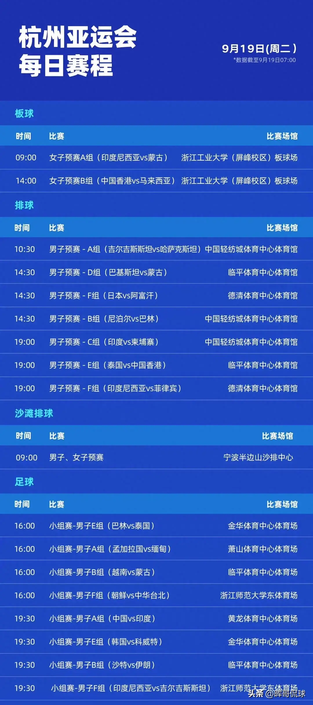 中央5台直播国足时间表:9月19日晚上19:25分会有亚运会小组赛