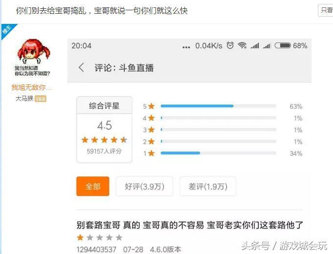 在今天,旭旭宝宝无意中的一句话提到了直播间房间号的问题,就让一些过激的黑粉怒刷了斗鱼一星的评价,导致斗鱼的评分下降,并且已经有了34%的一星评价,曾经在龙珠直播身上一星龙事件再度上演,而这次斗鱼成为被黑粉宣泄的目标变成一星鱼。