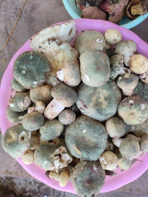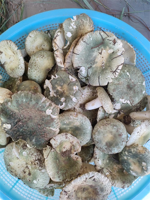 青头菌圆圆的头部有着草绿色的花纹,长在草丛中不易被人发现,野生菌都有掩藏自己的特点,云南人叫野生菌为小精灵很贴切,你要吃菌中毒,眼前飞来飞去的小人可能就是它们,你看到五彩斑斓的宫殿可能就是它们住的地方。