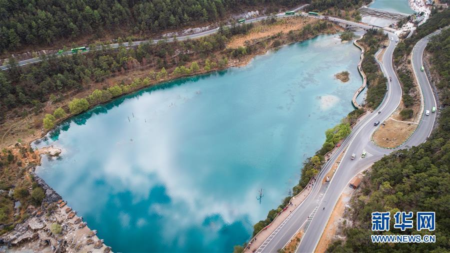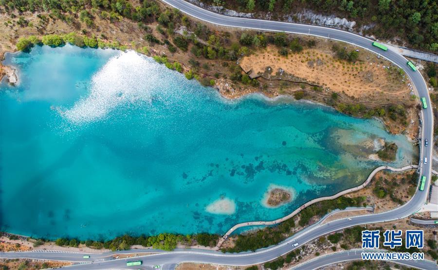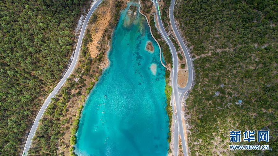 这是丽江玉龙雪山蓝月谷景色(4月21日无人机拍摄)。新华社记者 胡超 摄