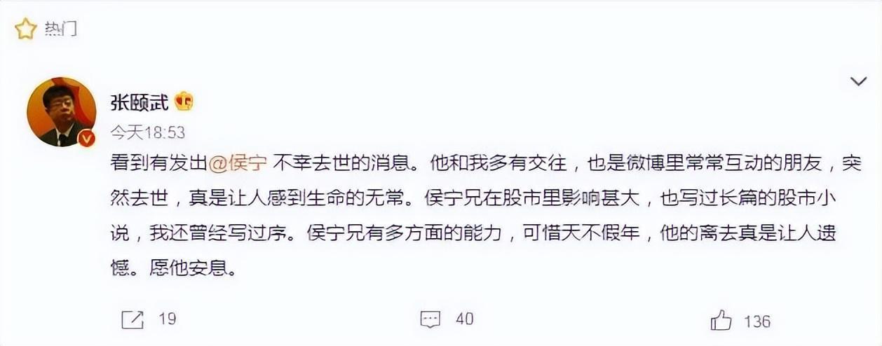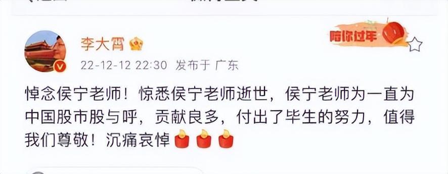 陪伴过很多投资者成长的大V侯宁,去世了。