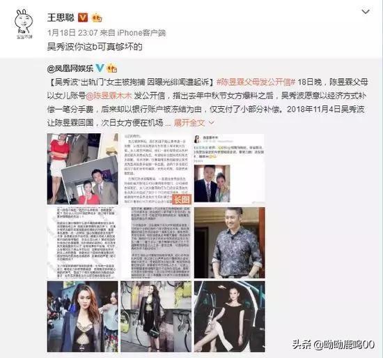 19日,事情再度发酵,吴秀波的妻子发布一条动态。指明,报警也是无奈之举,陈昱霖一次又一次向吴秀波一家索要巨额钱财,从几百万到几千万。其中提到”对方及其团伙“,看来陈昱霖的微信动态是早有预谋的,而这个团伙,也很有可能是指其父母。因为陈昱霖早就不拍戏了,不存在什么经纪人、公司之间的联系,而这次事件也只有她父母在中间做主要调和。小编在这里很好奇,在陈昱霖做了六年多的情人时,她的父母到底是扮演什么角色。