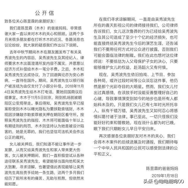 原来陈昱霖早在18年11月15日在北京的机场被朝阳区公安局带走,并以涉嫌敲诈勒索罪被捕关押。自己的女儿关了快两个月,老两口才发表了这么一封公开信,在不断检讨“我们没有管教好女儿“、希望女儿平安归来的同时,也指明吴秀波那边的人主动找份到陈昱霖,并提出给一笔“分手费“,“回国商议”,没想到被反将一军,女儿刚到机场就被捕。并且吴秀波公司表明,不能向公众披露这件事,否则将面临法律的制裁。