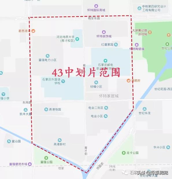 43中初中公办部片区划分1.北始槐安路,南止民心河及东延长线,东始体育南大街,西止富强大街。2.槐底村民子女。
