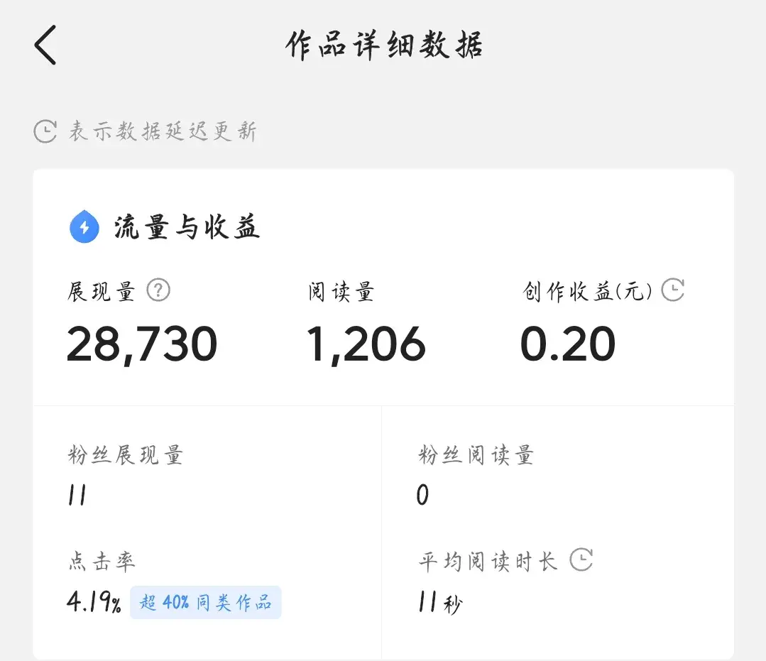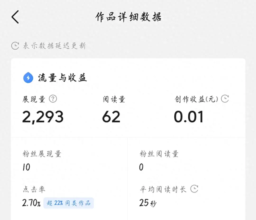 我上边有说过,并不是主要根据阅读量来决定的,刚好我有一篇数据能够侧面证明,这篇数据比较神奇,它的展现量只有414,但是有了0.01的收益,主要是由于它的点击率有3.14%,高于我的收益最低点击率2.7%,这也是让我将收益与点击率联想的主要原因。所以大家在发现一些作品的数据并不理想的时候先不要急着删除,说不定就有收益了呢!