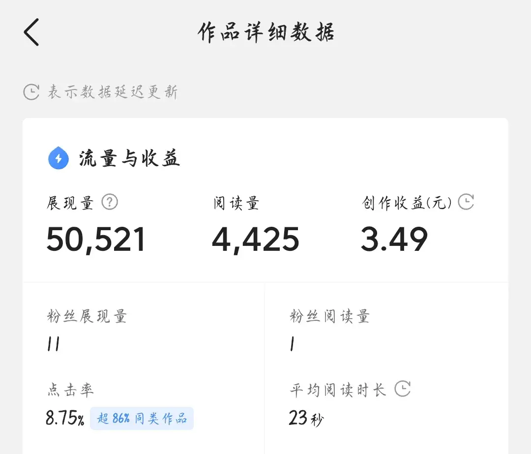 如果这个还不能够肯定,那么我接下来的一张图直接印证了我的猜测。50521的展现量和4425的阅读量,点击率更是高达了8.75%,而这篇作品的收益(3.49)更是可观的,这篇作品的收益如果按照点击率的计算方法显然是不可行的,三块和三毛三分的差距太大了,但是它的阅读量却与上一个两万多展现量一千多阅读量的差距并不大,仅仅是高了三倍,收益却是直线上升。