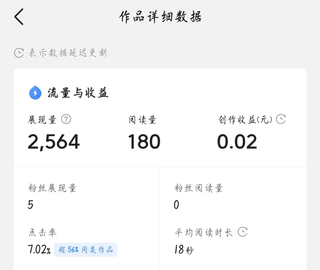 再来一张它的对照组(展现量相近,阅读量相远),这篇作品它的点击率(7.02%=180/2564)较高,但是展现量(2564)不是很好(我猜测展现量是跟点赞评论有关,这个以后有时间会另外分析),因此收益较低,如果仅仅只是这两张图片做对比,就给人一种收益只是由阅读量决定的错觉。