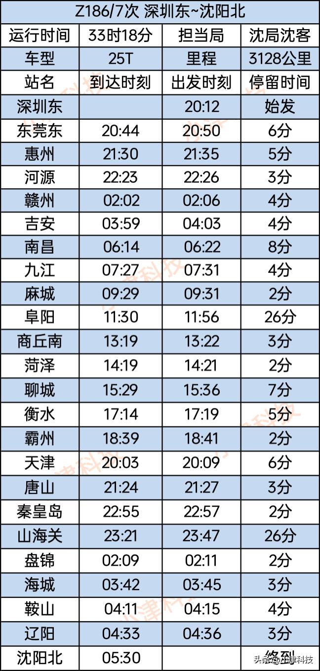 深圳东站至沈阳北站Z186/187次运行33小时18分,深圳东站、东莞东站、惠州、河源、赣州、吉安、南昌、九江、麻城、阜阳、商丘南站、菏泽、聊城、衡水、霸州、天津、唐山、秦皇岛、山海关、盘锦、海城、鞍山、辽阳、沈阳北。