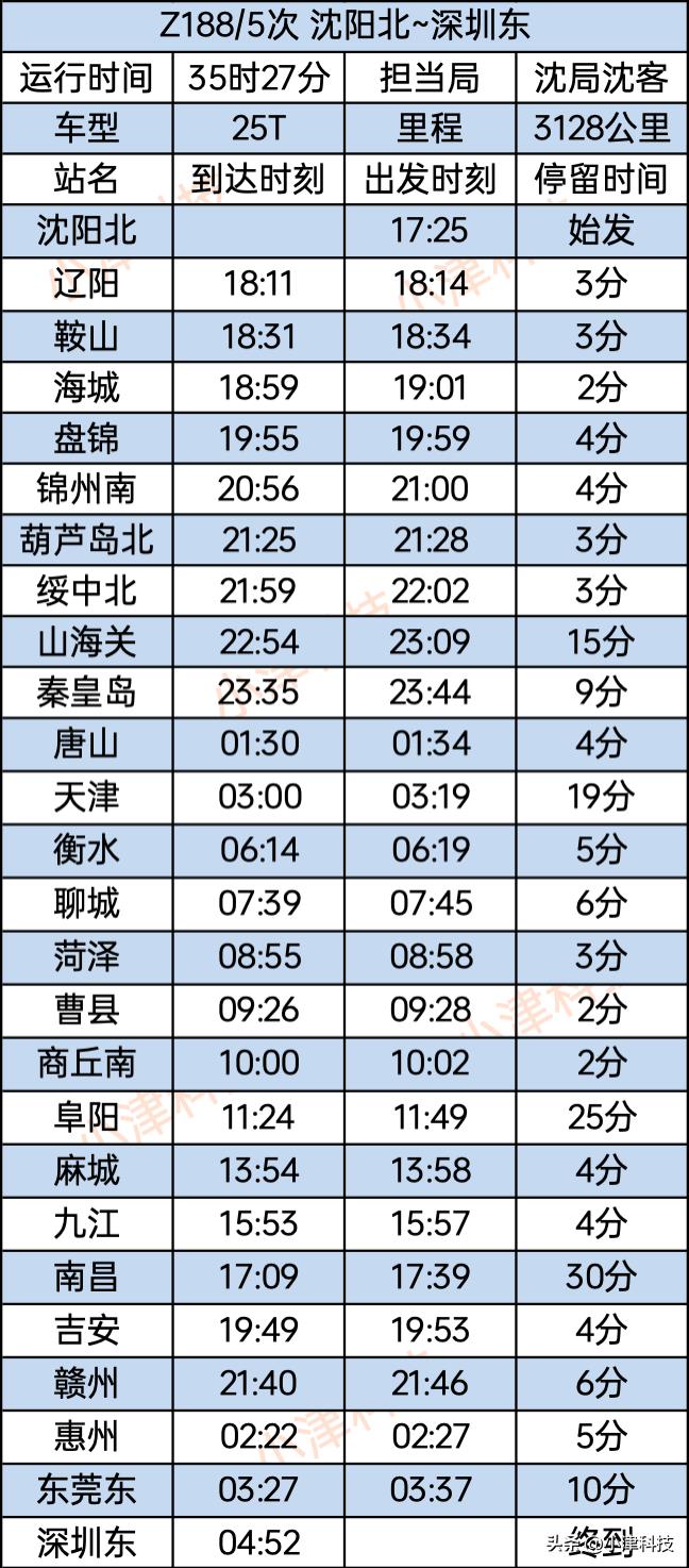沈阳北站至深圳东站Z188/185次运行35小时27分,沈阳北、辽阳、鞍山、海城、盘锦、锦州南、葫芦岛北站、绥中北站、山海关、秦皇岛、唐山、天津、衡水、聊城、菏泽、曹县、商丘南、阜阳、麻城、九江、南昌、吉安、赣州、惠州、东莞东、深圳东。