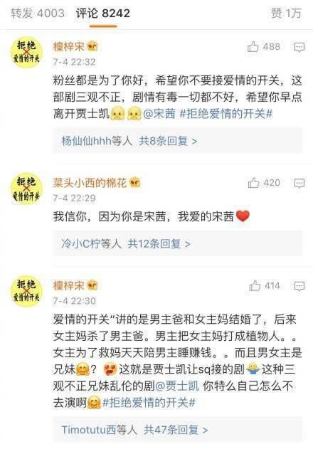 光看这个剧情确实是很狗血,而且严重违背人伦和价值观,粉丝们担心宋茜接下这部剧之后人气和形象受损,所以发起了强烈的抵制活动,而直接将矛头对准了宋茜经纪人贾士凯。