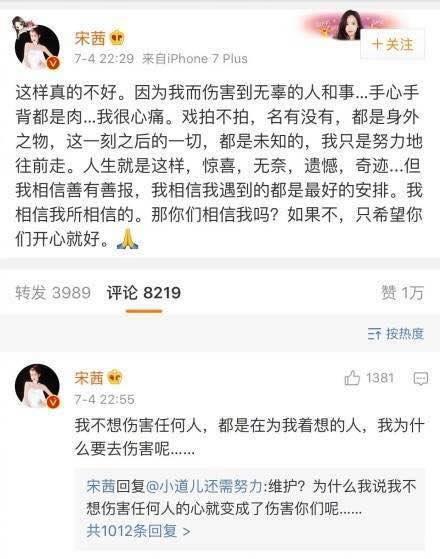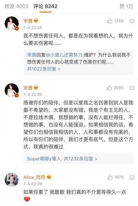 在这则微博下方的留言中,宋茜更表达了自己的诸多情绪,感谢粉丝陪伴的同时,更表示自己是个有主见的人,不是拉线木偶,想做的事没人能拦得住,不想做的事也没人能强迫。如果大家相信她的话,也希望相信她相信的人,有粉丝的陪伴,他们才更有底气,但以这种方式她很难过。她因为知道粉丝是为自己好,所以没有选择躲起来等到风平浪静。