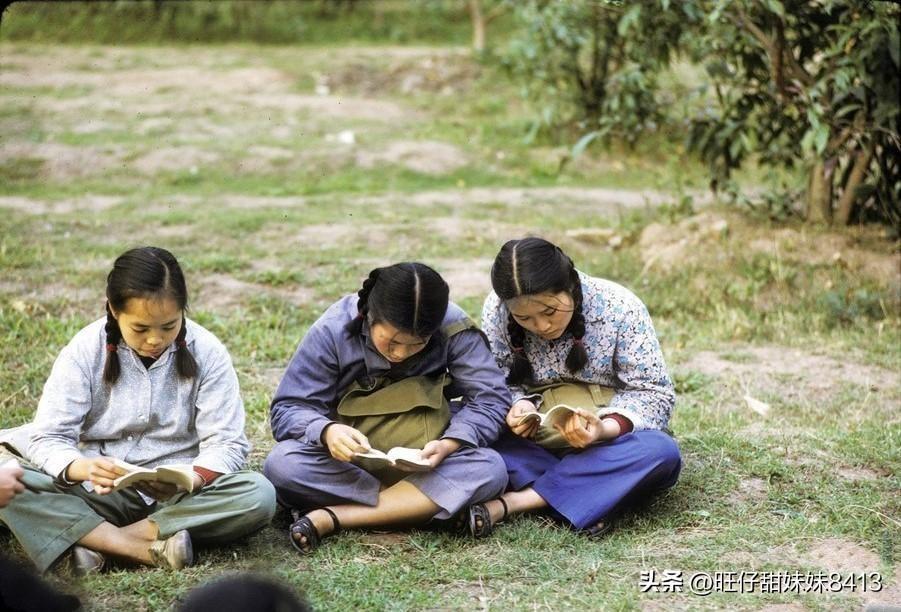 三名学生在席地而坐学习,在那个时候大家的求知欲望很强,没经过那年代的年轻人,他们没有体验过,品味过