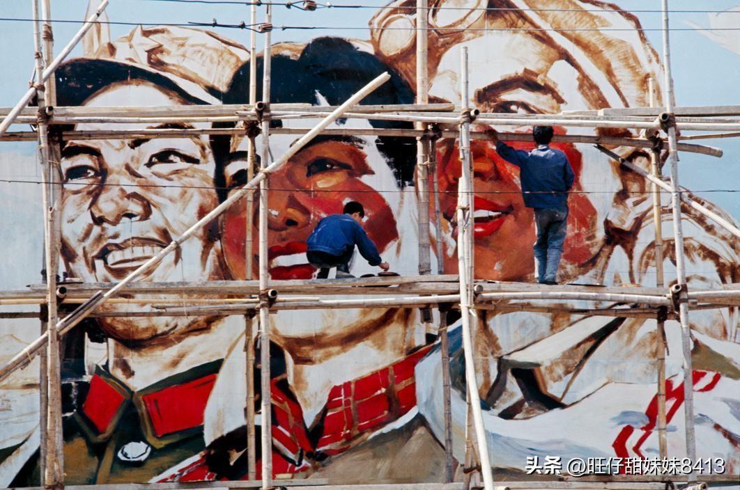 街头上正在绘制的工农兵题材巨幅宣传画。那年代的工人幸福感滿滿,无尚光荣。