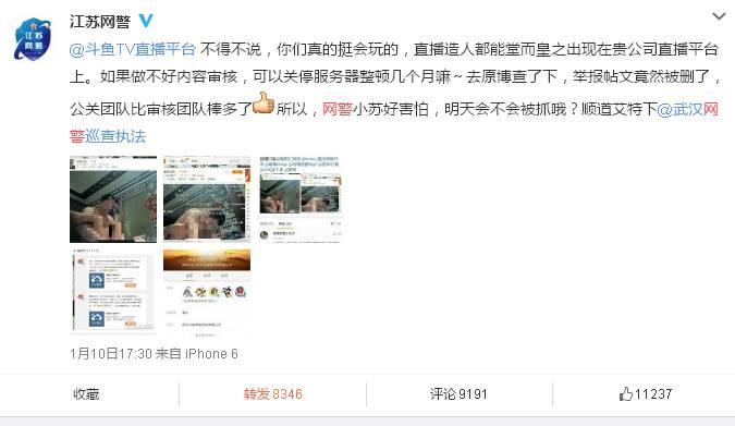 不过这事儿好像还不归江苏网警管。每日经济新闻(微信号:nbdnews)小编在斗鱼TV直播平台官方微博注意到,该平台的官方认证是"武汉斗鱼网络科技有限公司"。于是,江苏网警热心地在微博上@了一下武汉网警巡查执法。