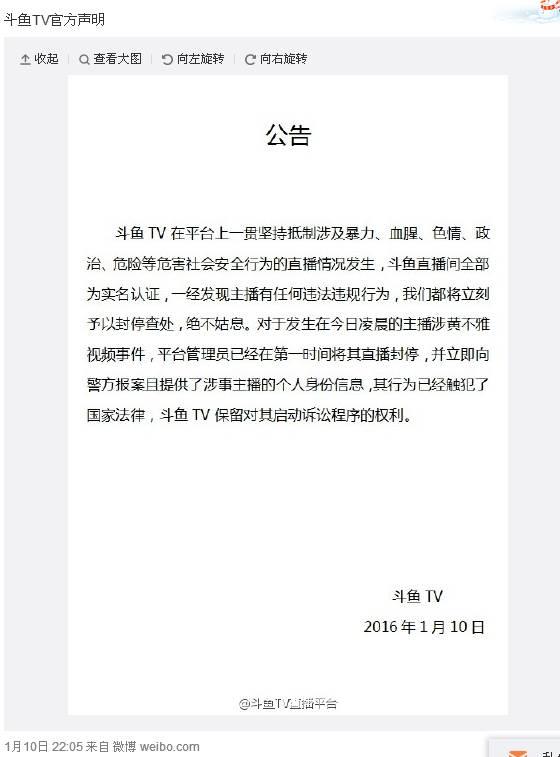 当事方斗鱼TV也迅速反应,发布了一条官方声明,称斗鱼直播间全部为实名认证,平台管理员已经在第一时间将其直播封停,并向警方报案且提供了涉事主播的个人身份信息。以下是斗鱼TV直播平台微博的官方声明: