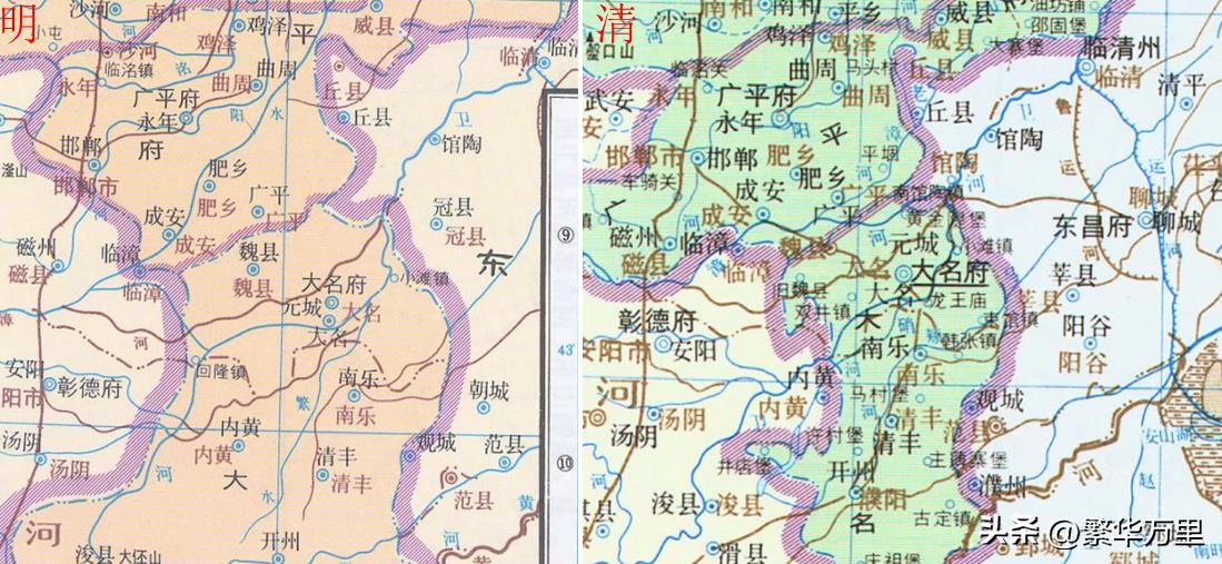 在清朝统治的前期,大名府下辖了1个散州、9个县,分别是:开州、大名县、元城县、南乐县、清丰县、东明县、长垣县、内黄县、滑县、魏县、浚县。广平府下辖了9个县,分别是:永年县、曲周县、肥乡县、鸡泽县、邯郸县 、成安县、广平县、威县、清河县。