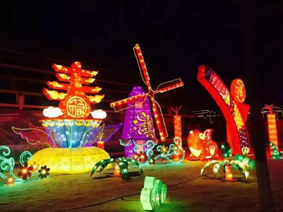 三大主题赏灯区、9组大型花灯、308个中型花灯。同时结合游乐园地标建筑及原有游艺设施,安装数十万小型LED灯,打造出幸福轮、奇幻城堡等39组光影创意景观。