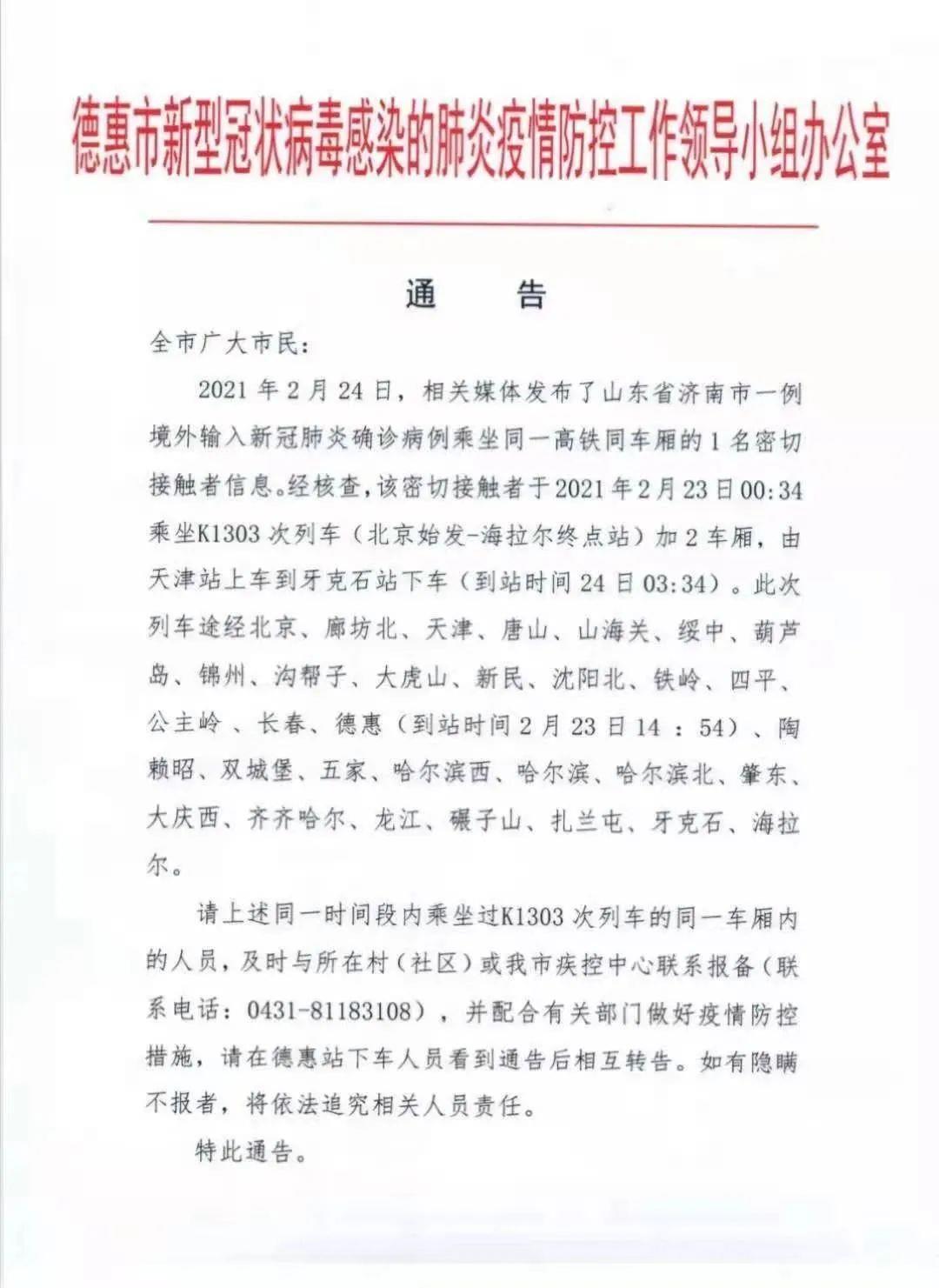 公主岭市关于紧急寻找与1名密切接触者接触人员的通告2021年2月24日,相关媒体发布了山东省济南市一例境外输入新冠肺炎确诊病例乘坐同一高铁同车厢的1名密切接触者信息。经核查,该密切接触者于2021年2月23日00:34乘坐K1303次列车(北京始发-海拉尔终点站)加2车厢,由天津站上车到牙克石站下车(到站时间24日03:34)。此次列车途经北京、廊坊北、天津、唐山、山海关、绥中、葫芦岛、锦州、沟帮子、大虎山、新民、沈阳北、铁岭、四平、公主岭(2月23日13:01到站)、长春、德惠、陶赖昭、双城堡、五家、哈尔滨西、哈尔滨、哈尔滨北、肇东、大庆西、齐齐哈尔、龙江、碾子山、扎兰屯、牙克石、海拉尔。请上述同一时间段内乘坐过K1303次列车的同一车厢内的人员,及时与所在村(社区)或公主岭市疫情防控指挥部联系报备(联系电话:0434-6262320),并配合有关部门做好疫情防控措施,请在公主岭站下车人员看到通告后相互转告。如有隐瞒不报者,将依法追究相关人员责任。特此通告。