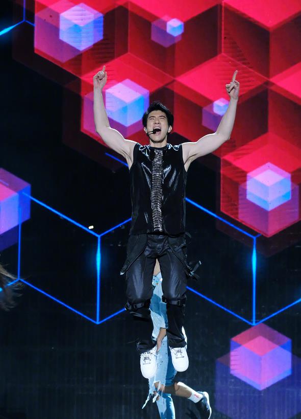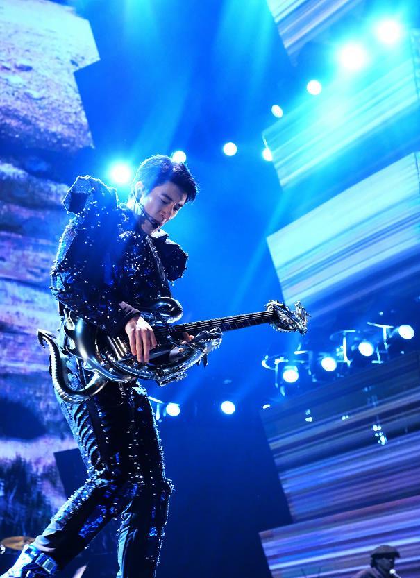 王力宏的这个造型朋克风十足,个性风浓郁,这个造型的设计也很有看点,这个套装的颜色是颇具神秘色彩的藏青色,很有光泽,神秘的蓝色增加了高贵气质,个性气息也很强。而且这件上衣是泡泡袖的,很少有男性会选择穿泡泡袖的服装,泡泡袖深受女性喜爱,因为这样的服装具有“公主风”气质。但是王力宏却证明型男也能穿泡泡袖,泡泡袖增加了造型的高级感,让王力宏身上显现出王子气质