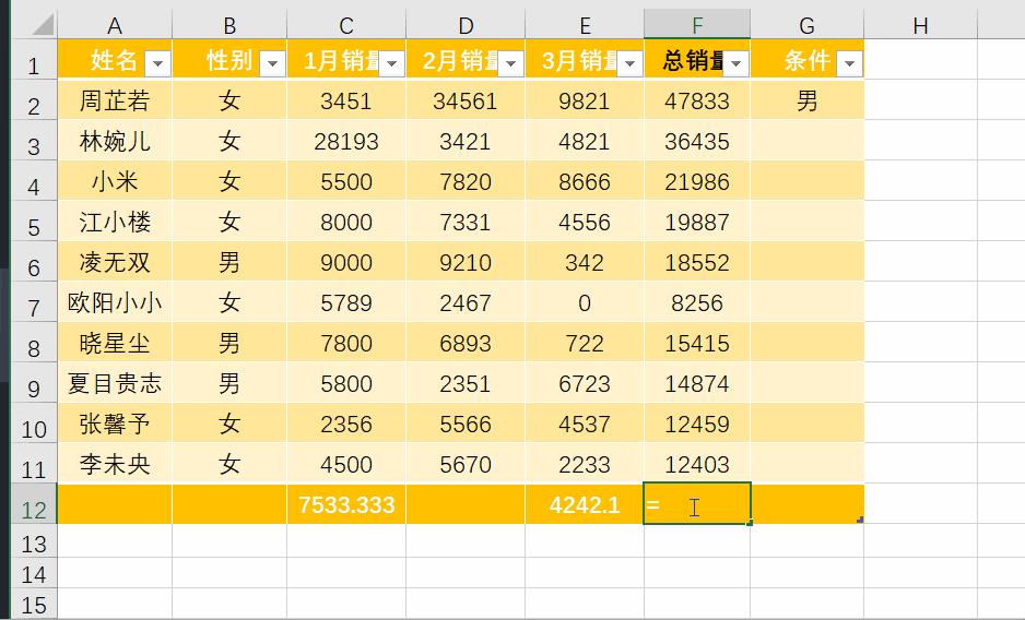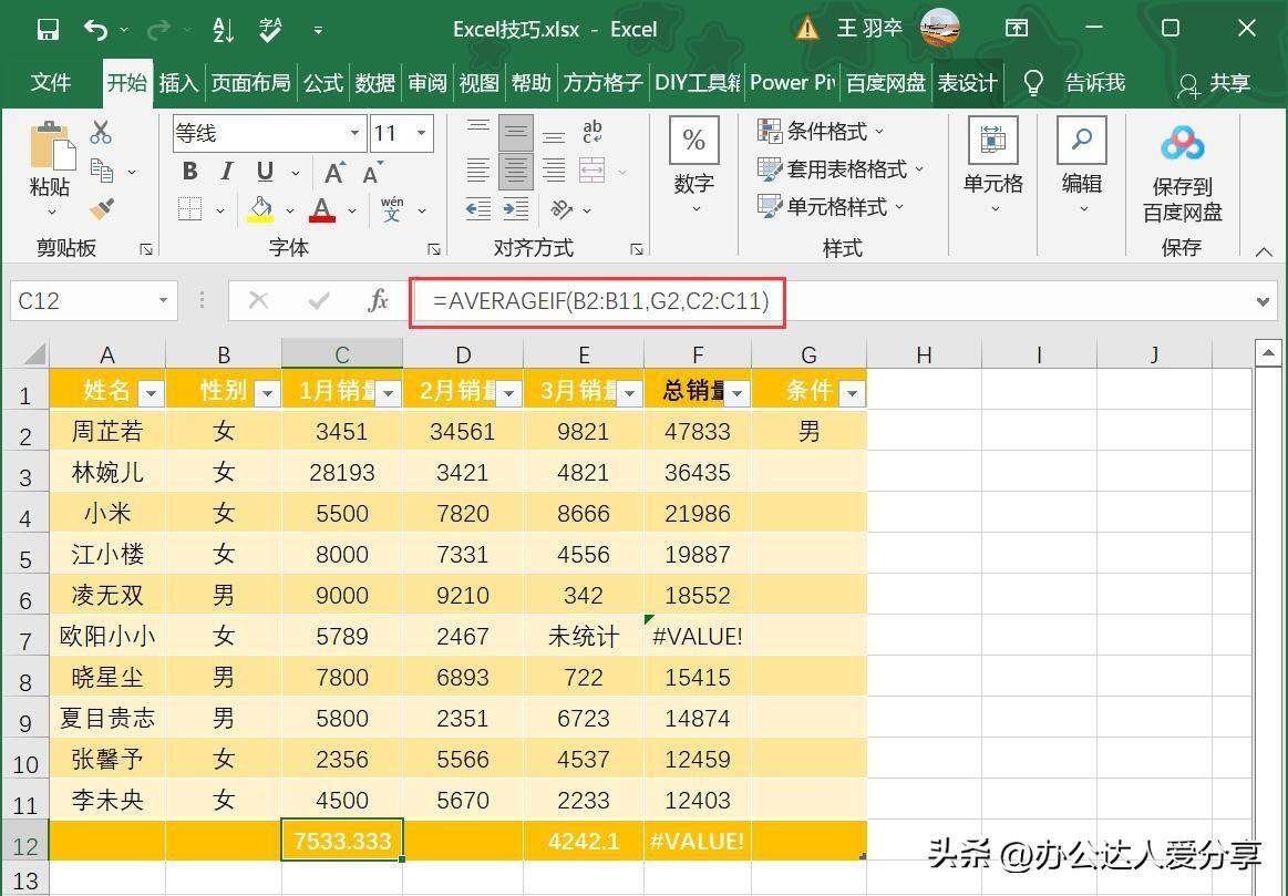=AVERAGEIF(条件区域性别B2:B11,条件女G2,销售数据C2:C11)