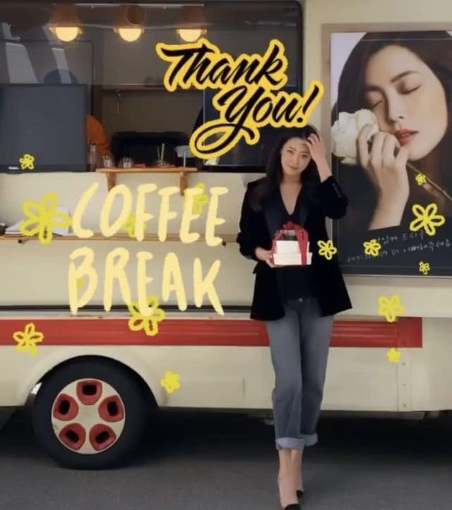 同样是在应援车旁打卡,金喜善身穿白色的衬衫搭配米白色的西装,下半身身穿浅绿的直筒裤,脚踩尖头鞋,依旧是职场干练的女神范,对着镜头的她也是不忘竖起两个赞的状态,真的是优雅知性又有气质的女神呀!