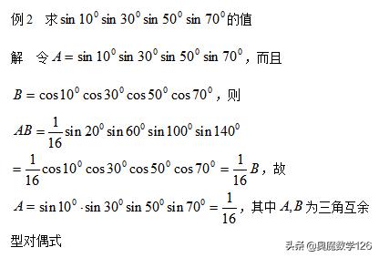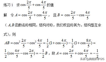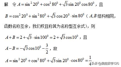 以上的“三角互余型对偶式”是三角函数求值中的常见方法,具体方法是:先构造出与要求解的问题A结构完成一致(角度相应不变化),但三角名称互余的对偶式B,然后通过A与B之间的内在关联(加减乘除)关系,求得A的三角函数值。