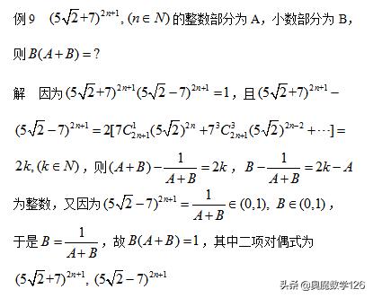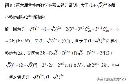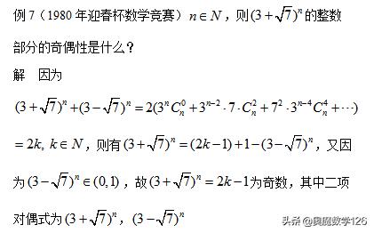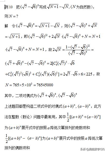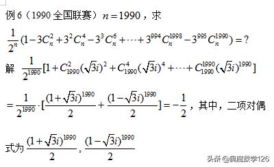 (感悟)本题是一道传统典型的二项式竞赛计算题目,在平时的竞赛培训中,一般都是引进复数,利用二项式通项就,进行按部就班的求解。但是,此次却给出了巧妙的二项型对偶式,对数利用复数的特征与计算,完成快捷计算。