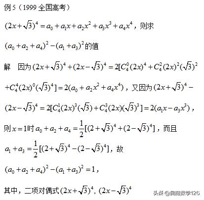 (感悟)本题是一道传统典型的二项式计算题目,变量赋值是完成二项式一般系数和的常用方法,但是这里,却巧妙的通过构造二项型对偶式完成了快捷求解。