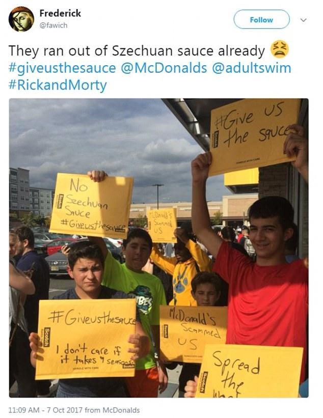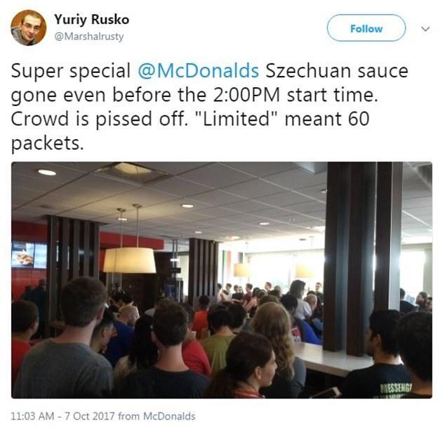 据英国《每日邮报》10月9日报道,本月7日,美国麦当劳多家分店时隔19年后再次推出一款仅限量供应一天的四川辣酱(Szechuan Sauce),受到美国民众的狂热追捧。数千粉丝在这些麦当劳分店排队购买辣酱,有些人甚至驱车4小时前来抢购,但是由于供应量太少,很多人都失望而归。在有些地方还引发了粉丝的抗议,这也因此招来了警察。