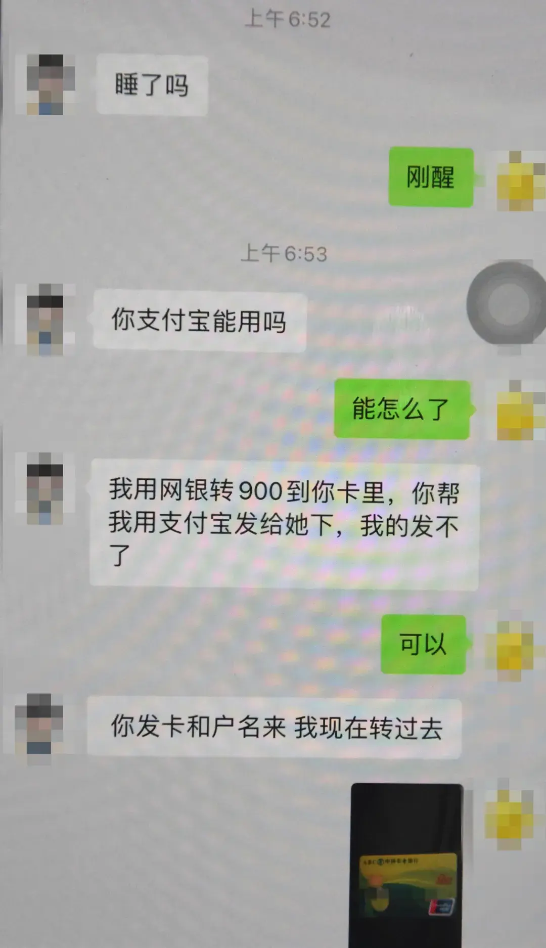 因为是女友发来的消息,睡意朦胧的钱先生根本没有怀疑,随即将自己的银行卡号发给了对方,几分钟后,对方就发来了一张向钱先生账户汇款转账900元的图片,并给了钱先生朋友的卡号。钱先生看到汇款转账的图片后,想着对方着急用,就立马通过支付宝将900元转到了对方的账户。