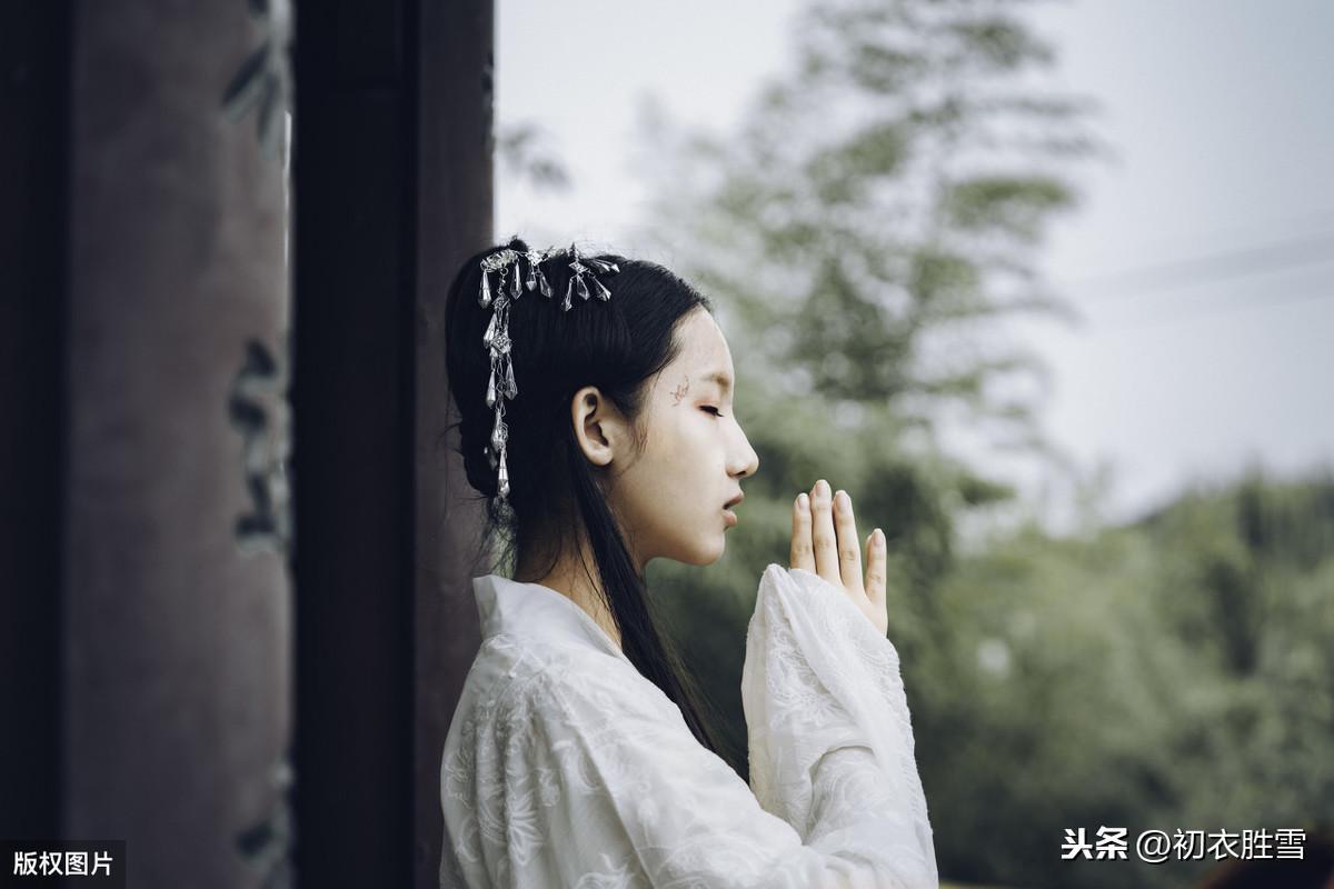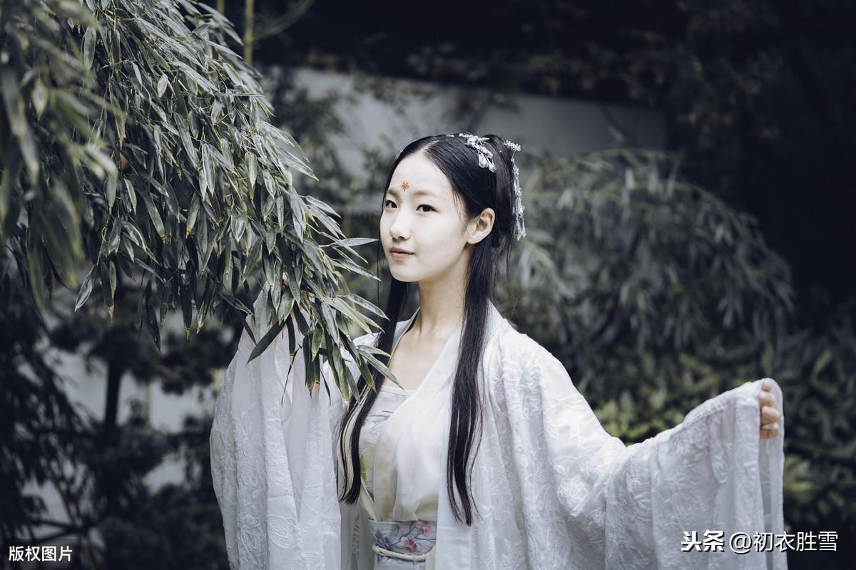 “苏家小女名简简,芙蓉花腮柳叶眼。十一把镜学点妆, 十二抽针能绣裳。十三行坐事调品,不肯迷头白地藏。玲珑云髻生花样,飘飖风袖蔷薇香。殊姿异态不可状,忽忽转动如有光。二月繁霜杀桃李,明年欲嫁今年死。丈人阿母勿悲啼,此女不是凡夫妻。恐是天仙谪人世,只合人间十三岁。大都好物不坚牢,彩云易散琉璃脆。”唐朝白居易《简简吟》