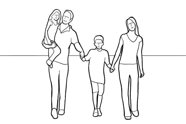 拍摄一家人手拉手走路的照片时,要注意间距相对均匀(如下例所示,可以携带年幼的孩子)。