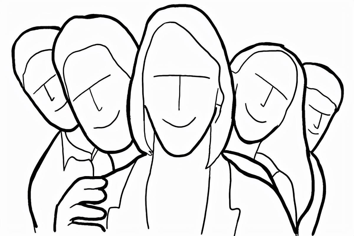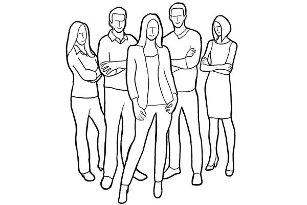 如果一个团队有一个已知的领导者,将他们放在前面效果会更突出,然后将其他所有人错开在后面和两侧。身体之间有一些重叠是可以的,要确保每个人都有足够的空间。