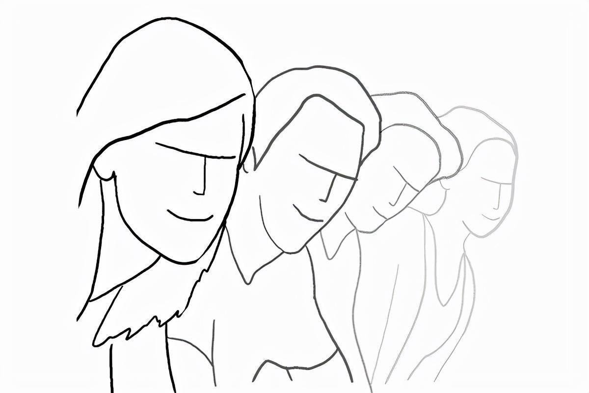 注意,每个人都站在前一个人的身后,并从肩膀上向镜头观望。通过直接靠在前面的人身上来支撑自己一点,这增加了构图的非正式性。