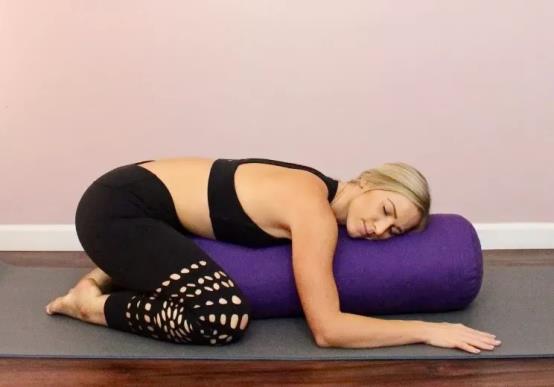 体式要点:上身趴在圆柱形枕头上,两条手臂分别放在身体两侧,小臂和掌心贴地,双腿弯曲,两双脚脚尖相贴。