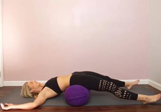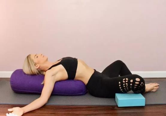 体式要点:上身和头部平躺在圆柱形枕头上,两臂放在身体两侧,小臂贴地臀部放在地面,双腿弯曲,两脚掌心相贴。