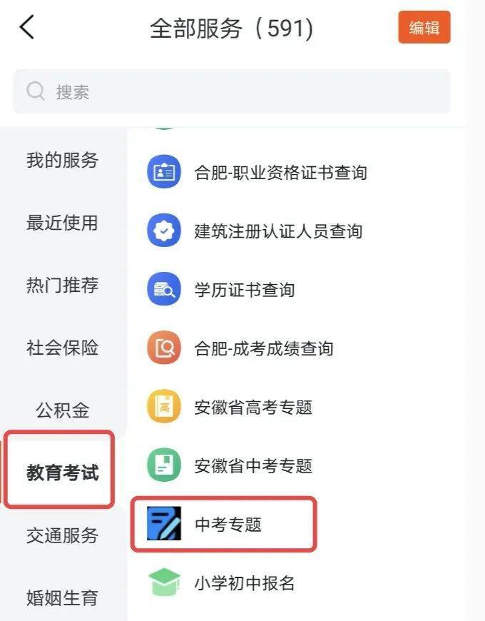 皖事通客户端首页→更多服务→教育考试中考专题;