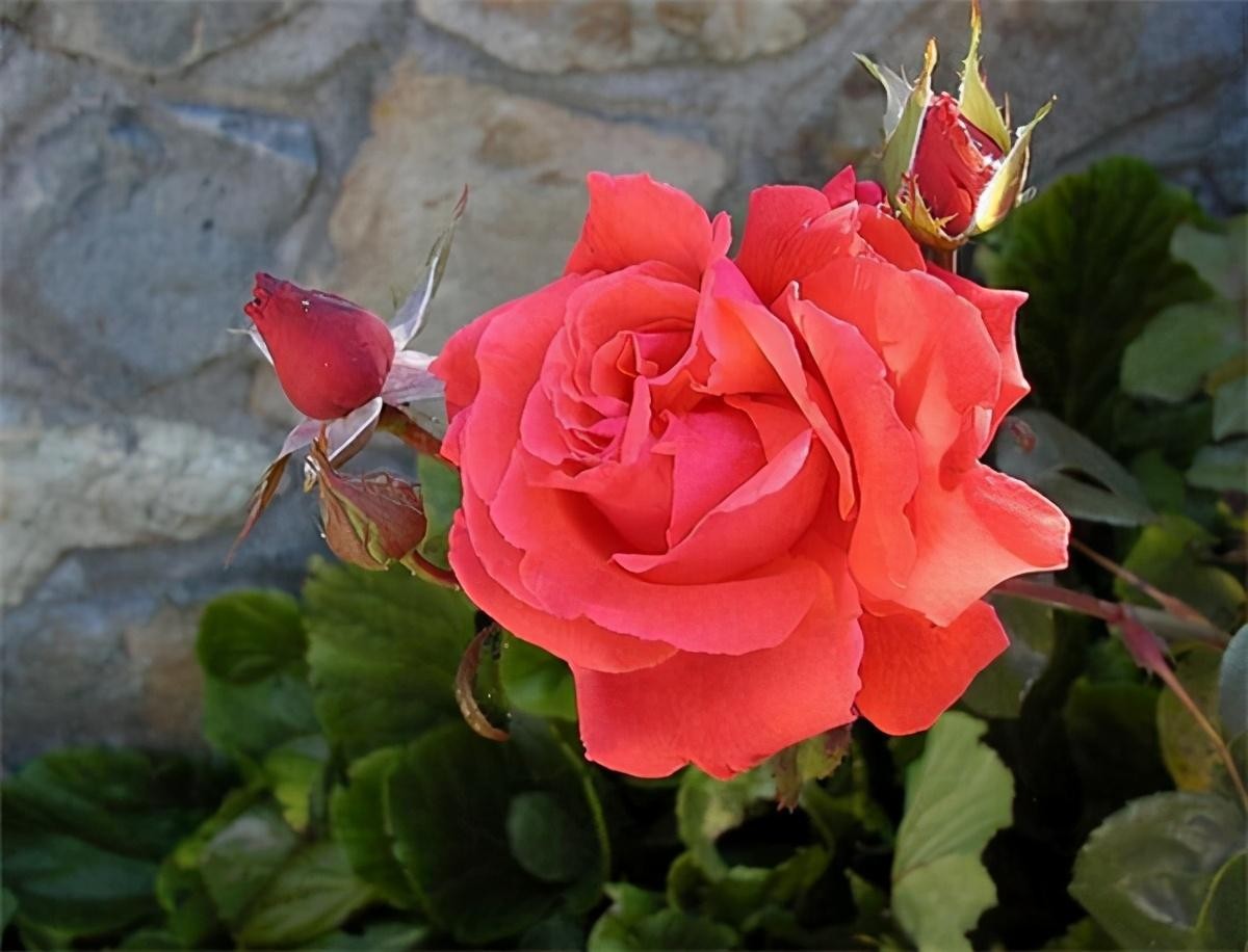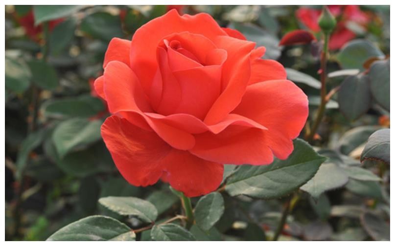 花径15-18cm,重瓣(花瓣40-45枚),朱红色,淡香,多季节重复开花。