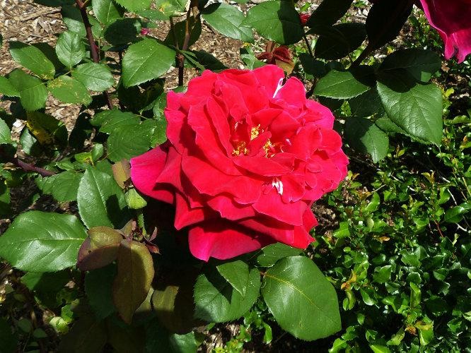花径10cm,重瓣(花瓣80枚),暗红色,温和香,多季节重复开花。植株高约150cm。