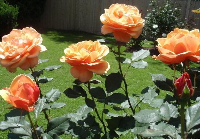 花径10cm,重瓣(花瓣26-40枚),橙色,淡淡的苹果香味,多季节重复开花。植株高约180cm。