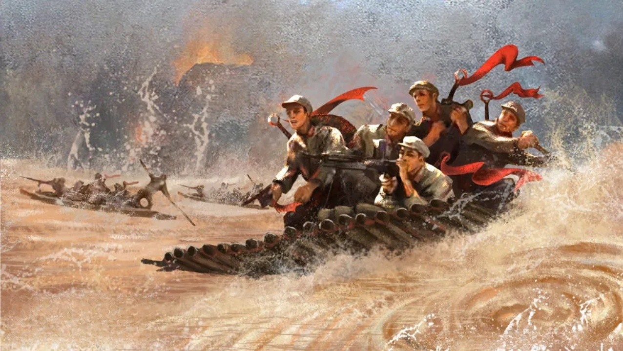 “轰!轰!轰!”又是一阵射击。在炮火的掩护下,渡船靠上了北岸。勇士们飞一样跳上岸去,手榴弹、冲锋枪一齐打向敌人。最后终于占领了敌人设在渡口的工事,为第二船的战友们杀开了一条通路,为全军渡河奠定了立足点。