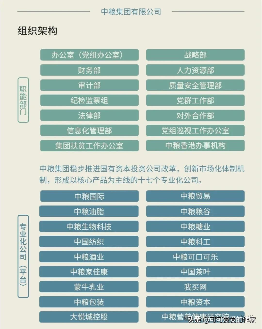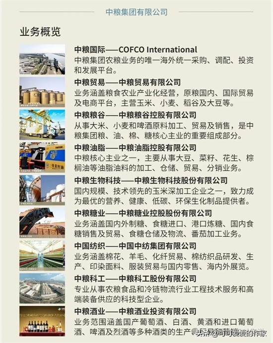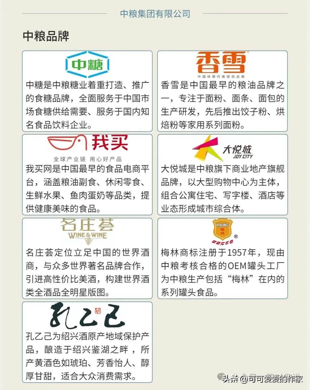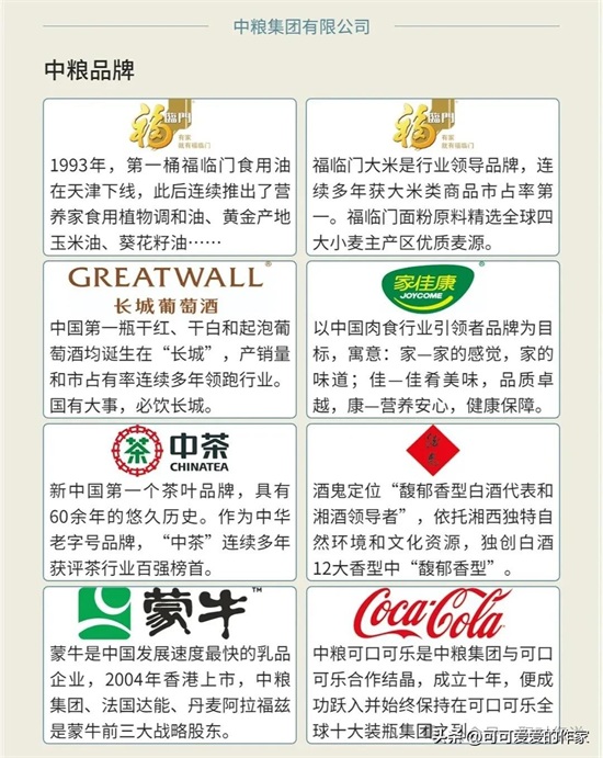 食品饮料:福临门、长城葡萄酒、金帝巧克力等乳制品:蒙牛乳业(年营收约800亿元)包装:中粮包装(中国最大的金属包装企业)