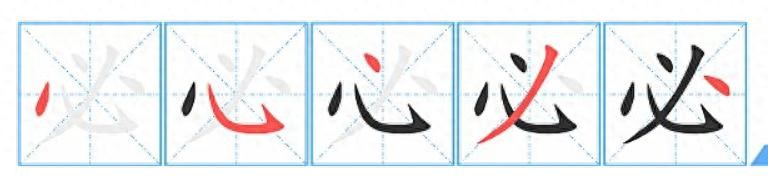 “必”字的笔顺是:左点、卧钩、上点、右点、撇